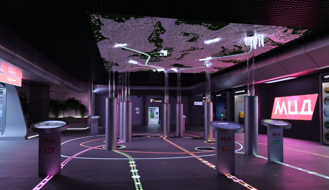 На стенах — интерактивная инсталляция, посвященная интересным местам и достопримечательностям, до которых можно добраться благодаря БКЛ.