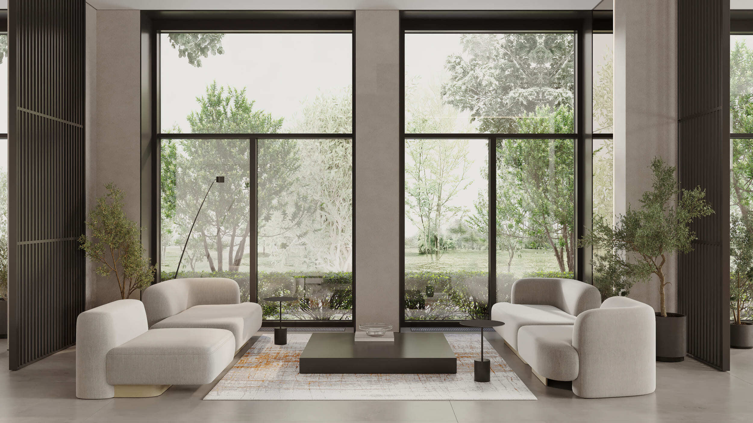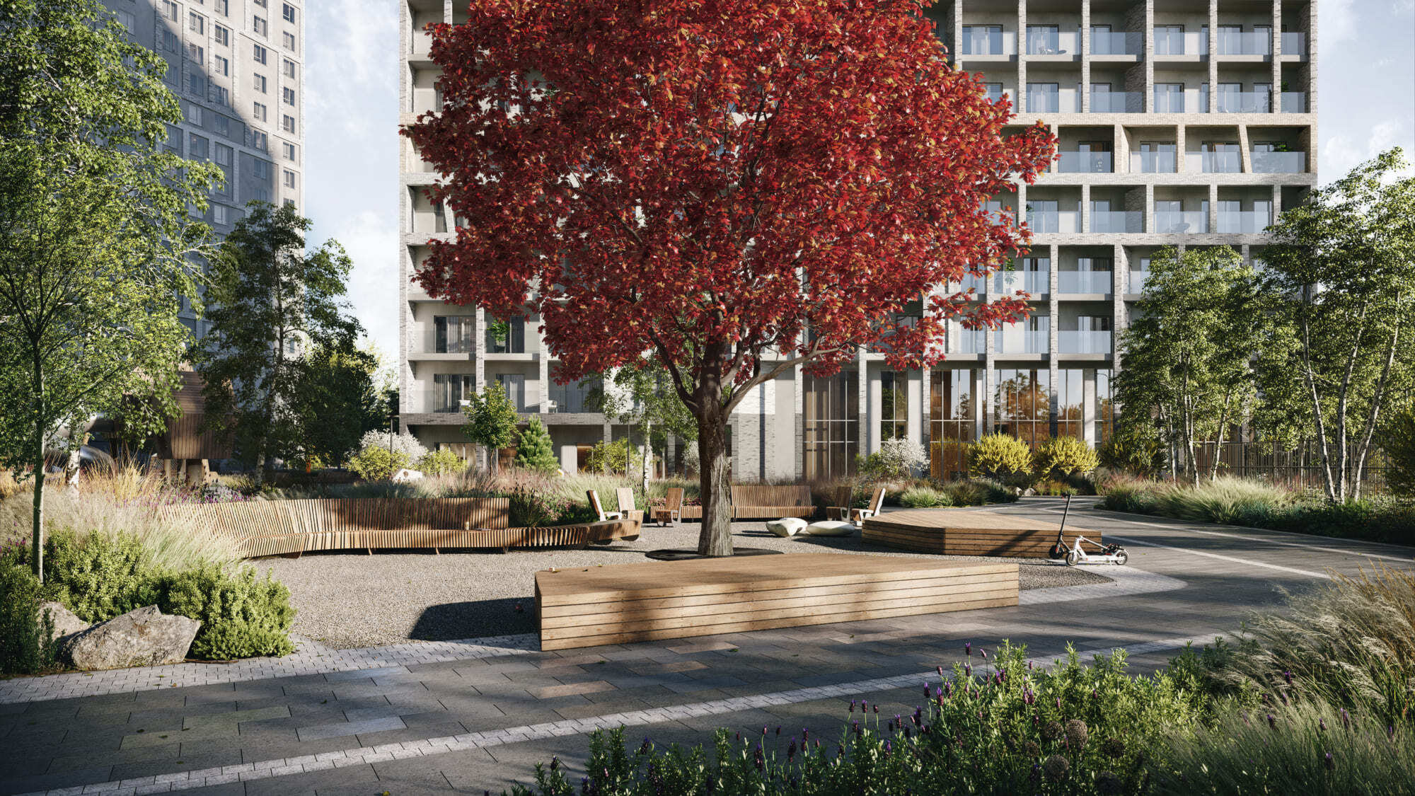 В Forst много необработанных каменных поверхностей, а на территории высажены преимущественно северные растения — канадская ирга, горная сосна, приречный клен. А в центре двора — раскидистое дерево, напоминающее древо жизни Иггдрасиль из скандинавской мифологии.