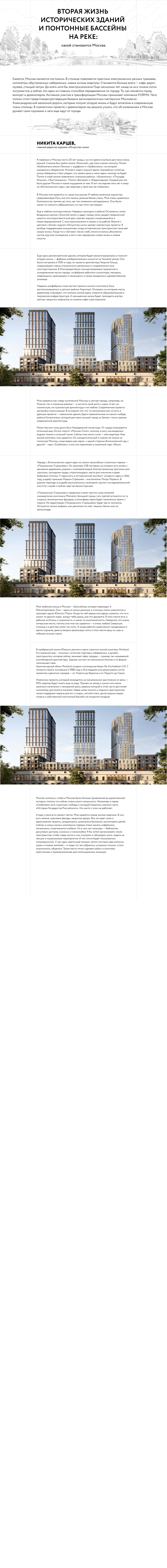 Девелопер FORMA специализируется на проектах премиум- и бизнес-класса с концептуальной архитектурой. Компания не боится браться за амбициозные задачи, такие как превращение бывших вагоноремонтных мастерских, признанных объектом культурного наследия, в новую точку притяжения столицы, или устройство для жителей комплекса понтонного бассейна прямо на Москва-реке. Каждый проект создается, опираясь на три фундаментальных принципа: гений места, дизайн-мышление и целостность образа.