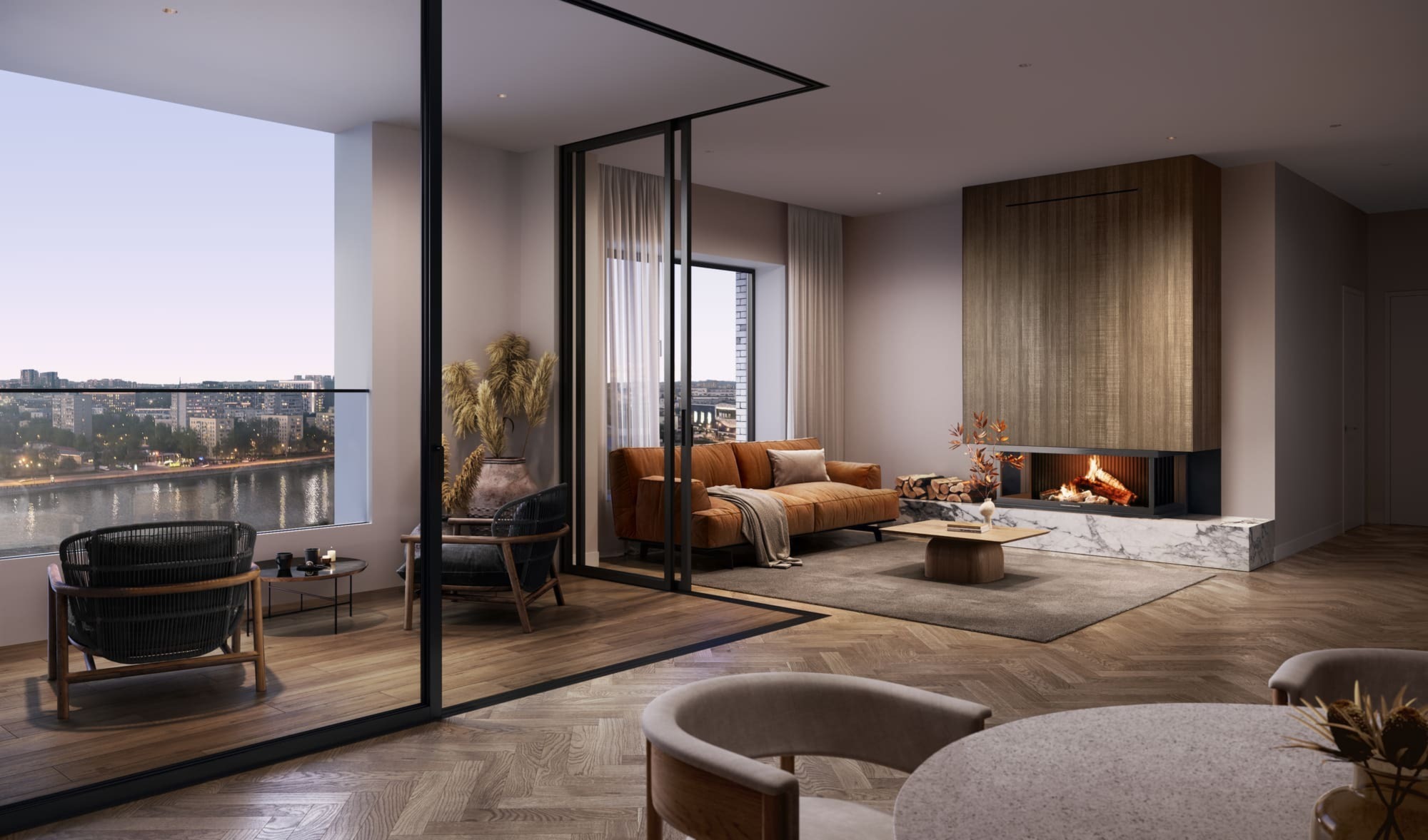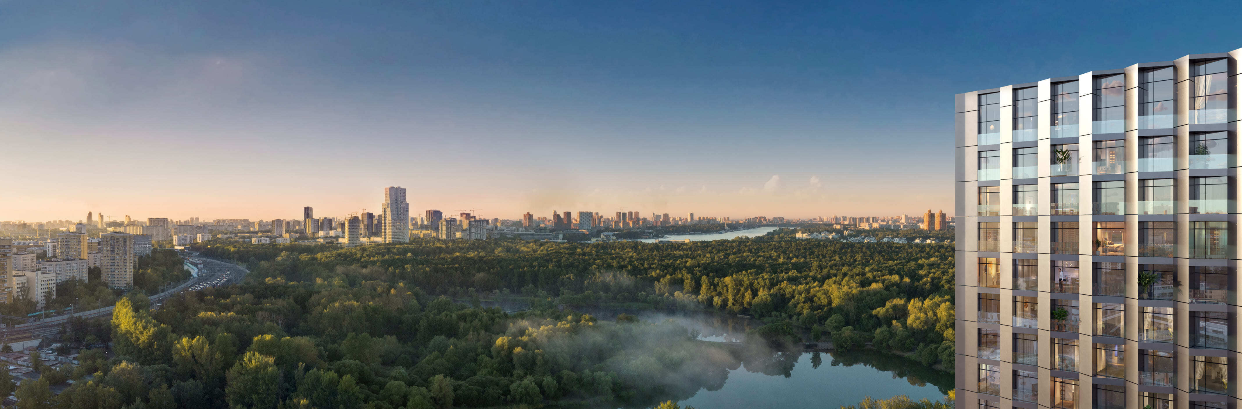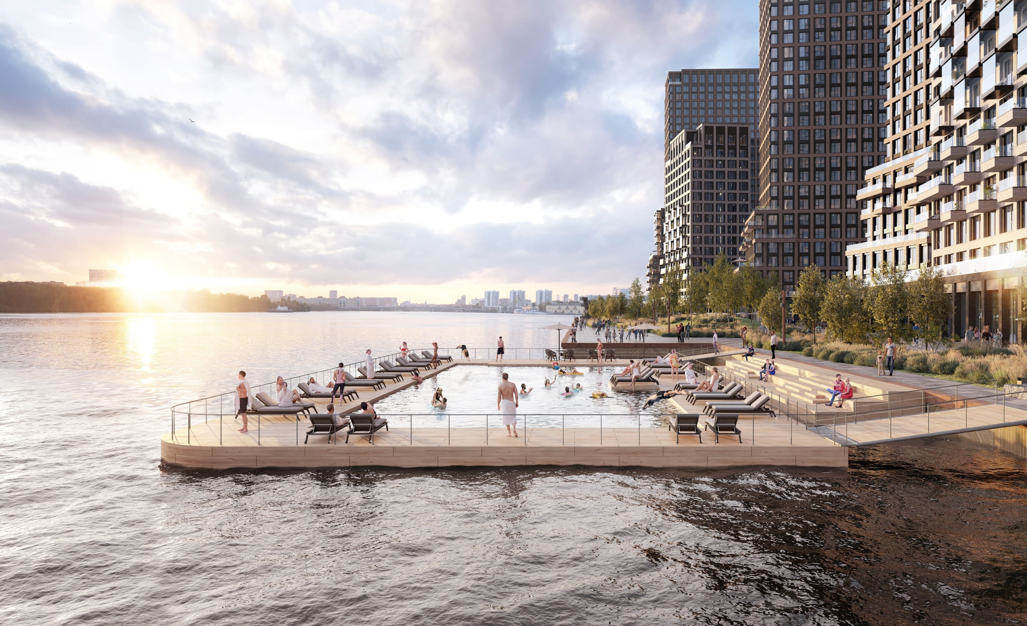 Изюминка проекта, который возводится на минимальном расстоянии от реки, — 95% квартир будут иметь вид на воду. Причем на запад, а значит вся магия закатов в сочетании с панорамой реки, ширина которой в этой части достигает километра, достанется жителям. Идею связи жилого и водного пространства также поддержат марина для яхт и лодок, центр водных видов спорта и собственный понтонный бассейн на открытом воздухе.