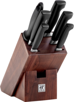 Во-первых, вам обязательно понадобится нож — без него много не приготовишь. Удобнее всего купить большой комплект — например, набор Zwilling Four Star 35221-007. В него входят все самые популярные типы ножей: для мяса, для овощей, для хлеба, а также универсальный и поварской ножи. Все они сделаны из нержавеющей стали. Материал подставки — ясень.