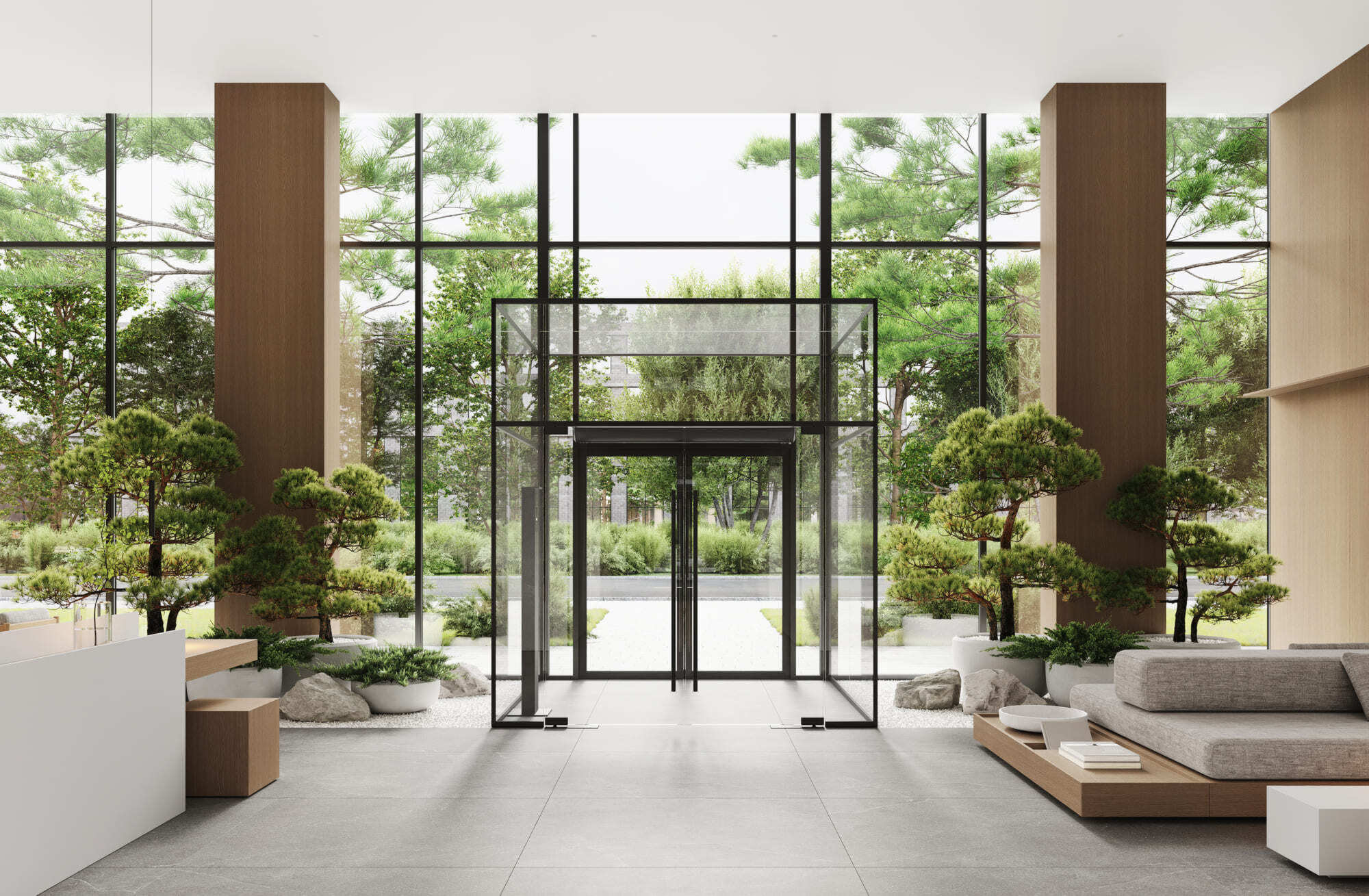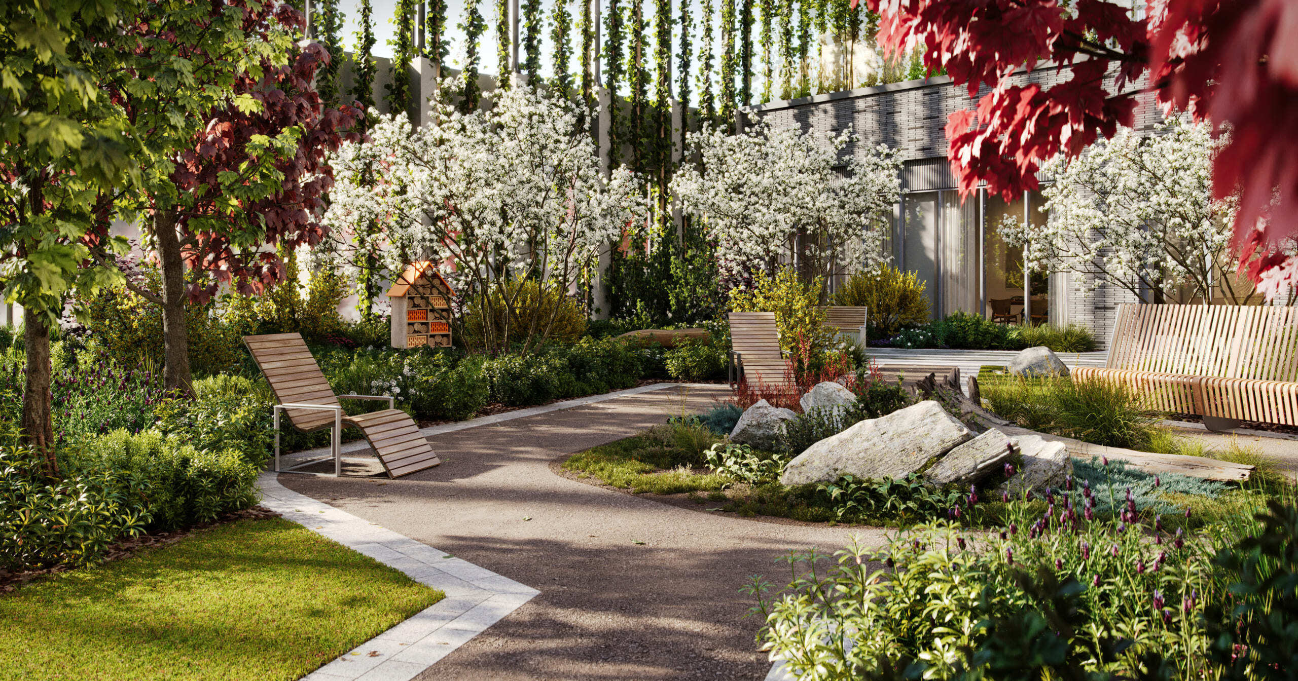 В Forst много необработанных каменных поверхностей, а на территории высажены преимущественно северные растения — канадская ирга, горная сосна, приречный клен. А в центре двора — раскидистое дерево, напоминающее древо жизни Иггдрасиль из скандинавской мифологии.