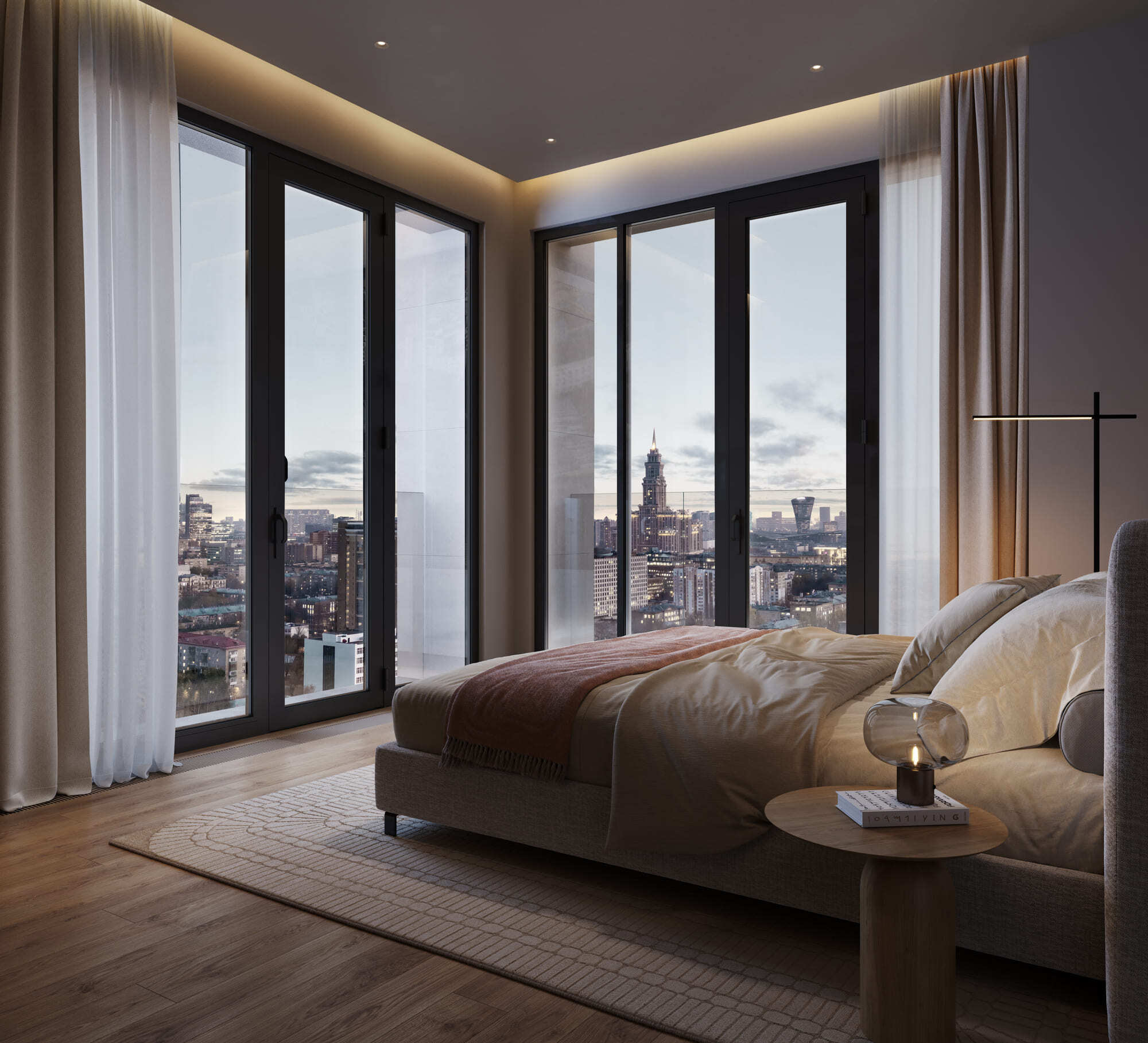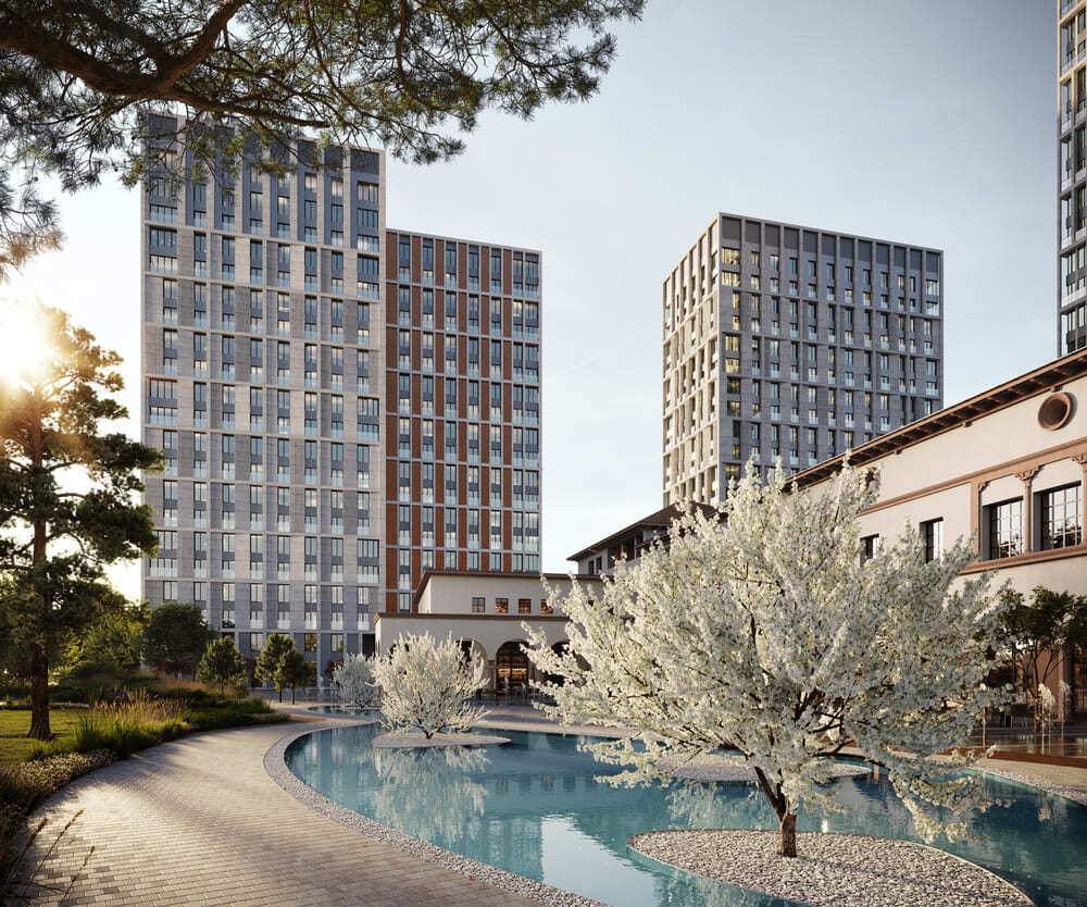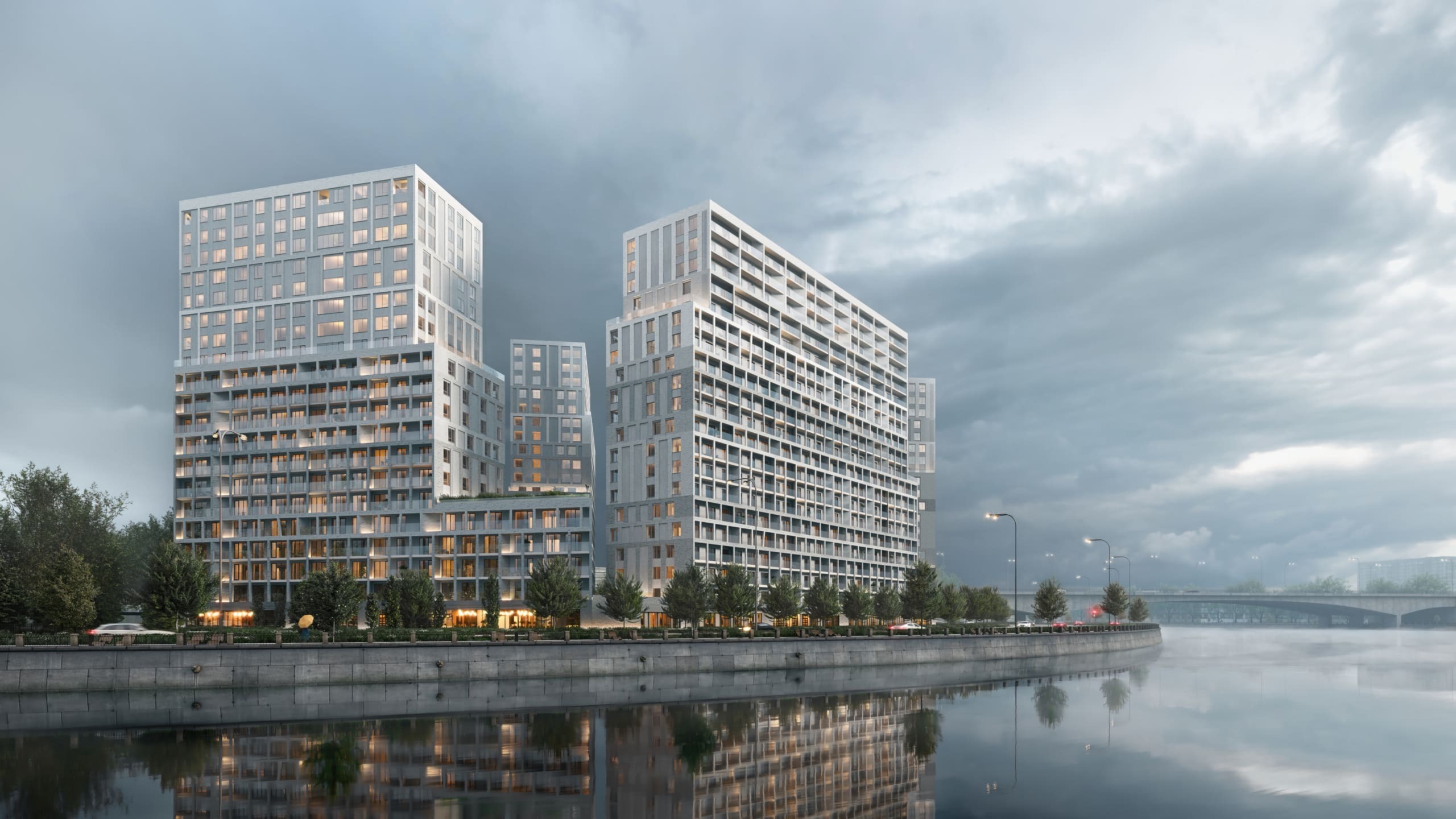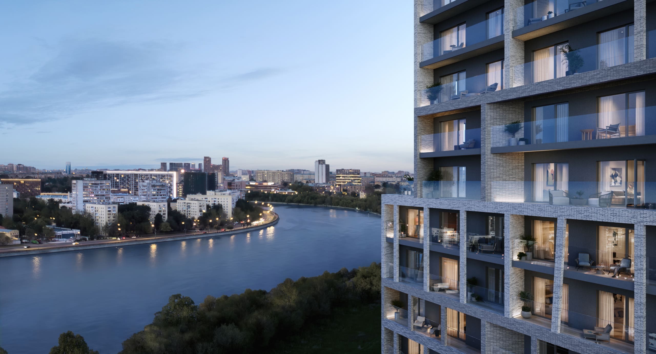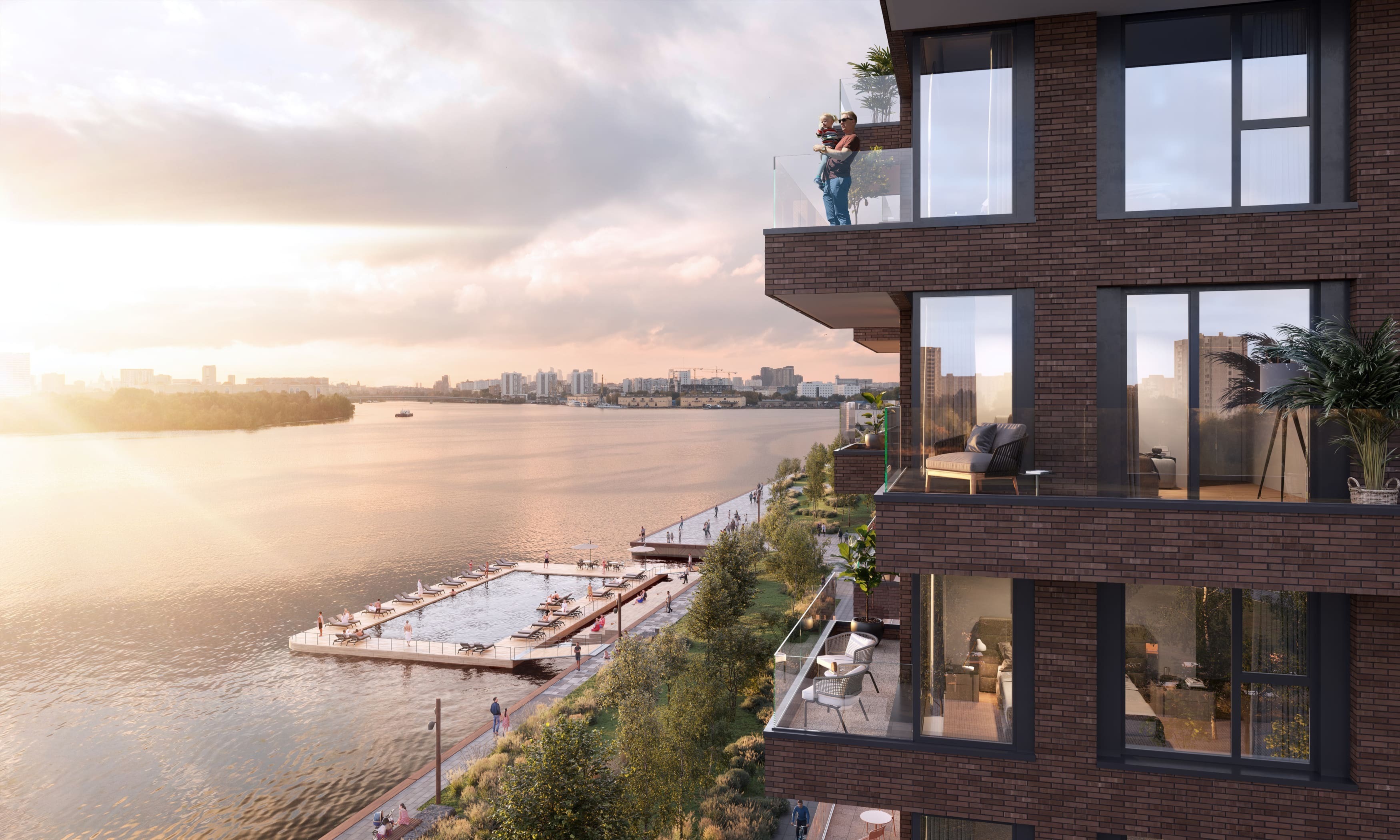 Изюминка проекта, который возводится на минимальном расстоянии от реки, — 95% квартир будут иметь вид на воду. Причем на запад, а значит вся магия закатов в сочетании с панорамой реки, ширина которой в этой части достигает километра, достанется жителям. Идею связи жилого и водного пространства также поддержат марина для яхт и лодок, центр водных видов спорта и собственный понтонный бассейн на открытом воздухе.