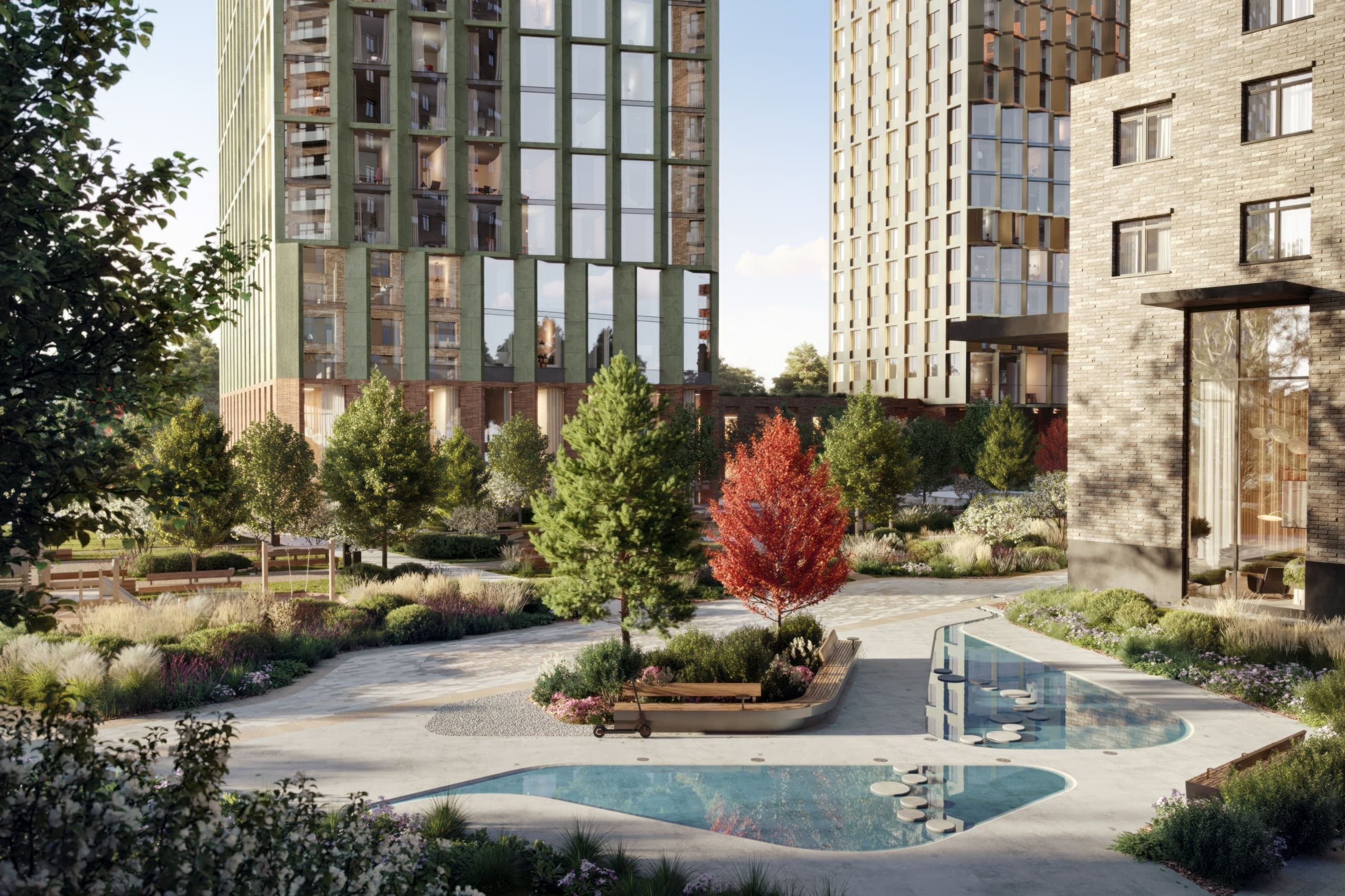 Уединенное и необычное место, отличающееся от стандартных проектов городских зеленых пространств, — парк на территории жилого комплекса Forst. Он вдохновлен Скандинавией и ее образами: скалами, фьордами и островами. А монументальные корпуса, как будто выросшие в Даниловском районе на берегу Москвы-реки, тоже цитируют утесы норвежских фьордов.