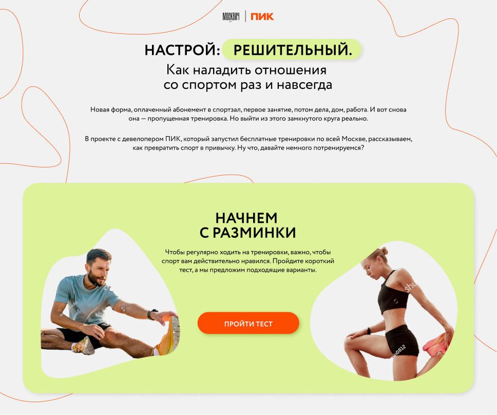 В проекте с девелопером ПИК, который запустил бесплатные тренировки в жилых кварталах по всей Москве, рассказываем, как превратить спорт в привычку. Ну что, давайте немного потренируемся?