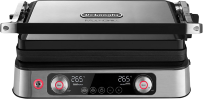Delonghi CGH1112D — еще один достойный внимания электрогриль. У него в комплекте две съемные пластины с антипригарным покрытием. Одна, рифленая, идеальна для стейков, птицы и рыбы, а гладкая подойдет для овощей и морепродуктов. Готовить, конечно же, можно на обеих одновременно, причем контроль температуры у каждой пластины свой. Как и у модели Tefal, у CGH1112D есть встроенный дисплей, на который выводится вся нужная информация о работе гриля.
